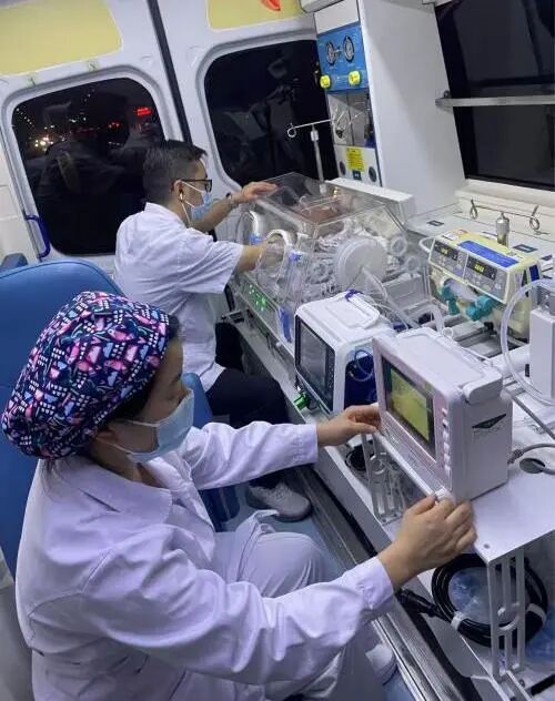 转运团队由一名新生儿科主治医生、一名新生儿科护士、一名急诊科护士和一名高级司机组成。短短10分钟,团队就迅速集结完毕,并配备了完整的“移动ICU”套件,包括新生儿转运培养箱、便携式呼吸机、多参数监护仪、输液泵和急救药物。其中,用于运送新生儿的保温箱可以说是新生儿的“生命堡垒”。恒温、恒湿、防抽动设计Hoque可全面应对旅途中的各种挑战,为儿童提供最安全的保护。