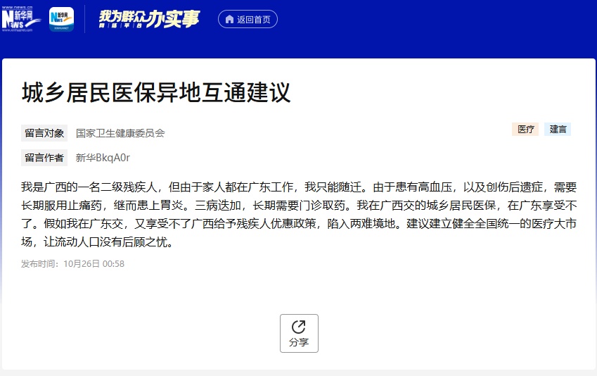 编者按:在医疗水平全面提升的背景下,健康保险权益保护越来越受到社会各界的关注。近日,有网友在新华网“我为大众做实事”网络平台反映,自己在外地就医时遇到了困惑。中国医保邀请江西省医保办福利保障处原处长、原一级调查员蔡海清进行详细解答。具体细节如下。从网友反映的情况来看,罪魁祸首是对现行异地医疗保障政策缺乏了解。相关政策的解读应考虑到这并非特例。根据政策规定,现行规定,居住在农村的参保人员,包括医疗救助对象,长期异地就医可办理异地医疗费用登记,享受异地医疗费用直付服务。住院、普通门诊、异地直接支付的慢病特病门诊医疗费用,原则上按照医疗所在地确定的支付范围及相关规定(基本医保药品、医疗服务项目、医用耗材等支付范围),并执行基本医保基金最低支付标准、支付比例、支付限额、门诊慢病、特病分类等相关政策。由保险覆盖的地点确定。简而言之,就是执行就医地的医保清单和就医地的医保治疗政策。可以为在其他地方寻求治疗的会员直接付款和注册通过两个常见渠道获得:线上和线下。网上办理:这种方式最为便捷,既可以通过全国通用渠道办理,也可以通过区域专用渠道办理。全国通用渠道:首先,通过“国家医保局”微信公众号,点击“微服务”→“外部全国医疗挂号”,选择挂号类型,输入信息,上传材料(或签署个人承诺书)并提交。接下来,打开全民健康保险服务平台应用程序,进入“院外就诊登记”部分,按照提示选择您的医疗机构、保险机构、诊所和挂号类型,填写信息,上传并提交您的材料。三、打开支付宝应用,点击医保→医保办理→现场病历。点击,选择申请信息,填写材料并提交。投入的地方渠道:各省市都有湖北鄂惠办APP、湖南“湘医保”APP、江苏“江苏医保云”APP、江西感付通APP等地方平台。投保人可以登录相关平台,在健康保险相关版块找到外部病历条目,按照当地指示完成流程。线下办理:投保人携带相关材料到各级医保机构柜台、覆盖地区各级医保柜台、政务服务中心办理。在某些地区,您还可以在街上的健康保险柜台完成该过程。所需文件通常包括有效身份证件(通常是居民身份证)、社会保障卡或电子健康保险优惠券。 “异地就诊登记表”;长期居留证明材料(居住证、户口簿等;大约是在某些地区,它可以代替个人宣誓);柜台工作人员确认单证无误后,当场完成申报手续。如果您是长期居住在异地的参保人,您可以使用异地就医直付服务,在您居住地的保险指定医疗机构就医、购药。或者持医保卡在异地办理就医挂号手续,扫卡(医保卡或社保卡)或码(电子医保码)。您居住地的基本健康保险。居住地认定并参保的医疗受益人,可以继续在居住地购买保险,并在居住地享受优惠保险(如政府资助保险、重大疾病保险待遇等)。居住地,不用担心失去享受优惠健康保险合同的资格。此外,由于各种原因,在一些地区,居住在其他地方的长期护理对象的医疗费用必须手动报销到其家庭记录或保险覆盖范围。